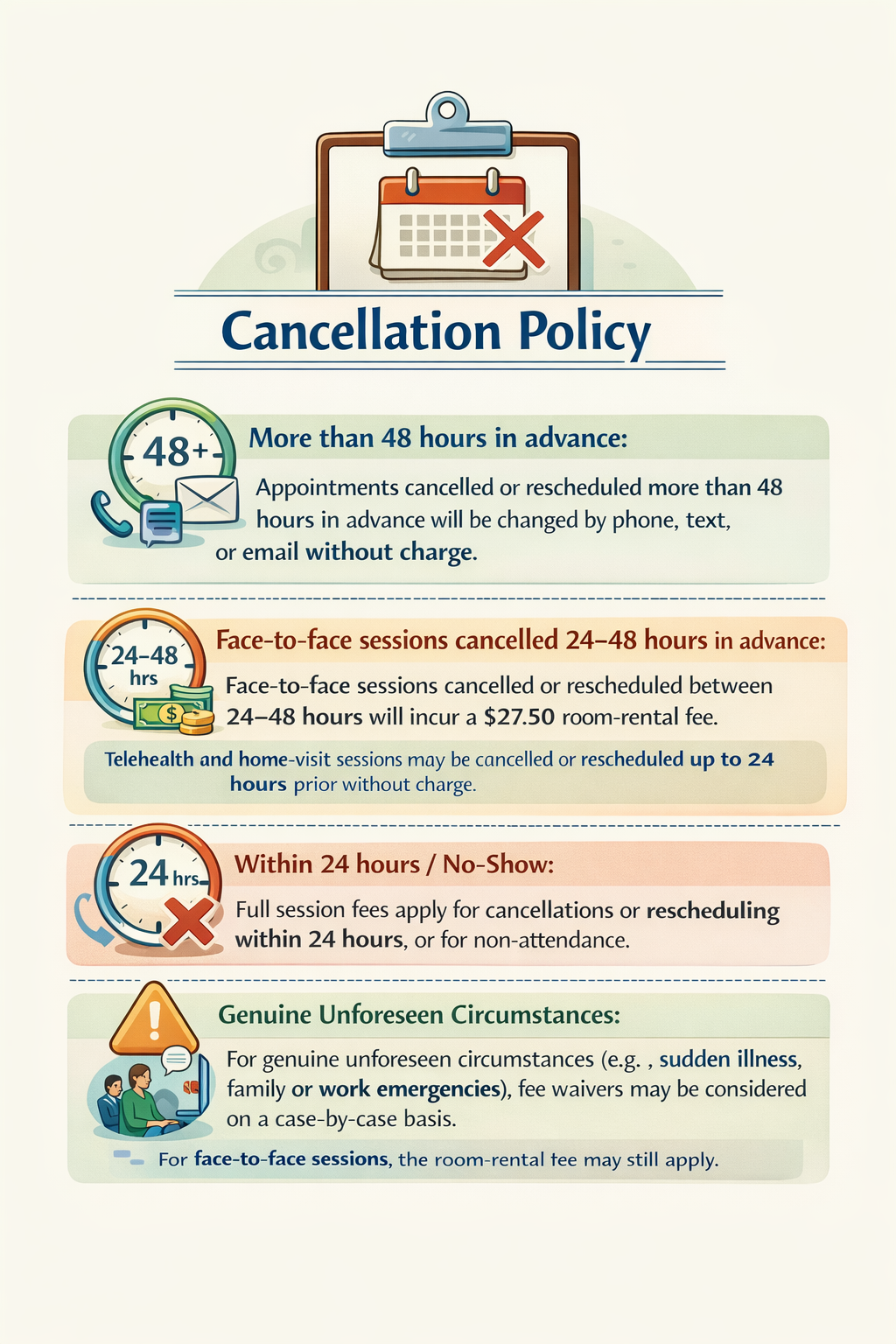 Face-to-face sessions cancelled or rescheduled between 24–48 hours will incur a $27.50 room-rental fee, or $55 for initial consultation (2 hours)