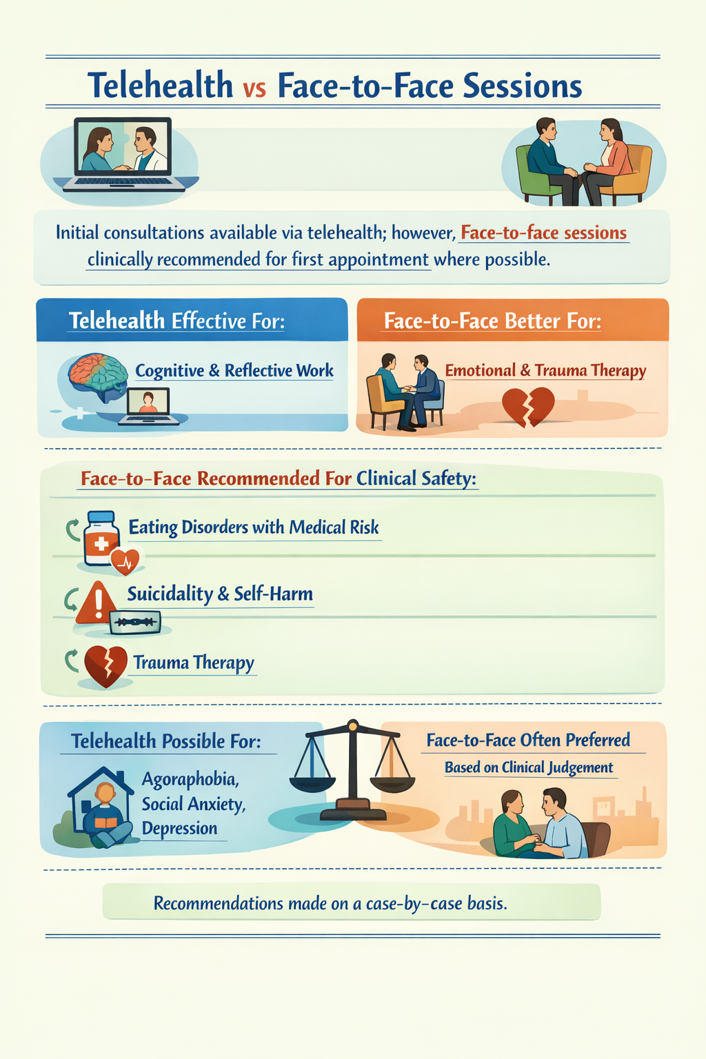 I may recommend face-to-face sessions for other presentations based on clinical judgement. This is assessed on a case-by-case basis.